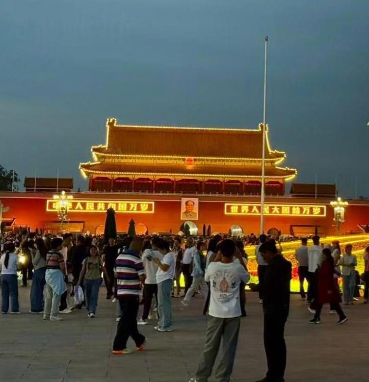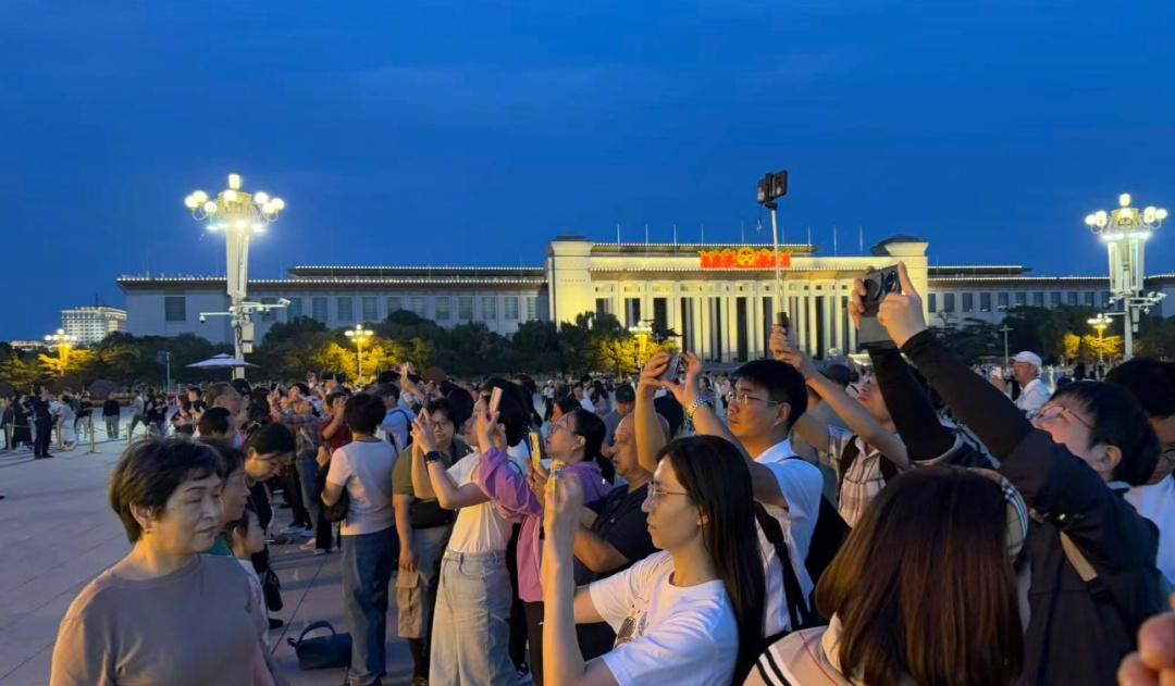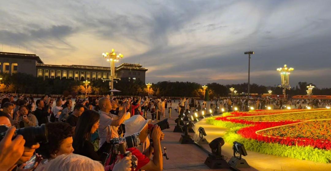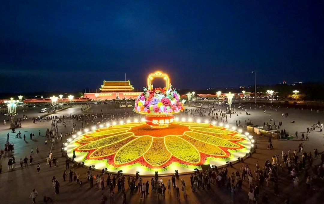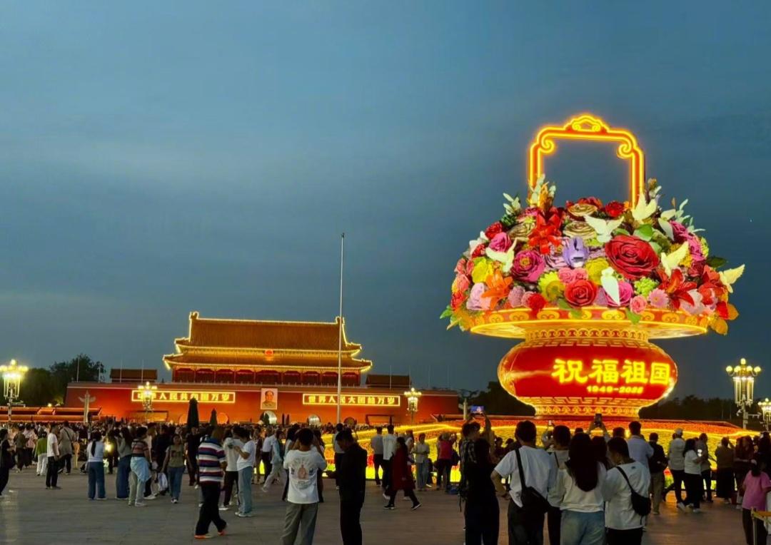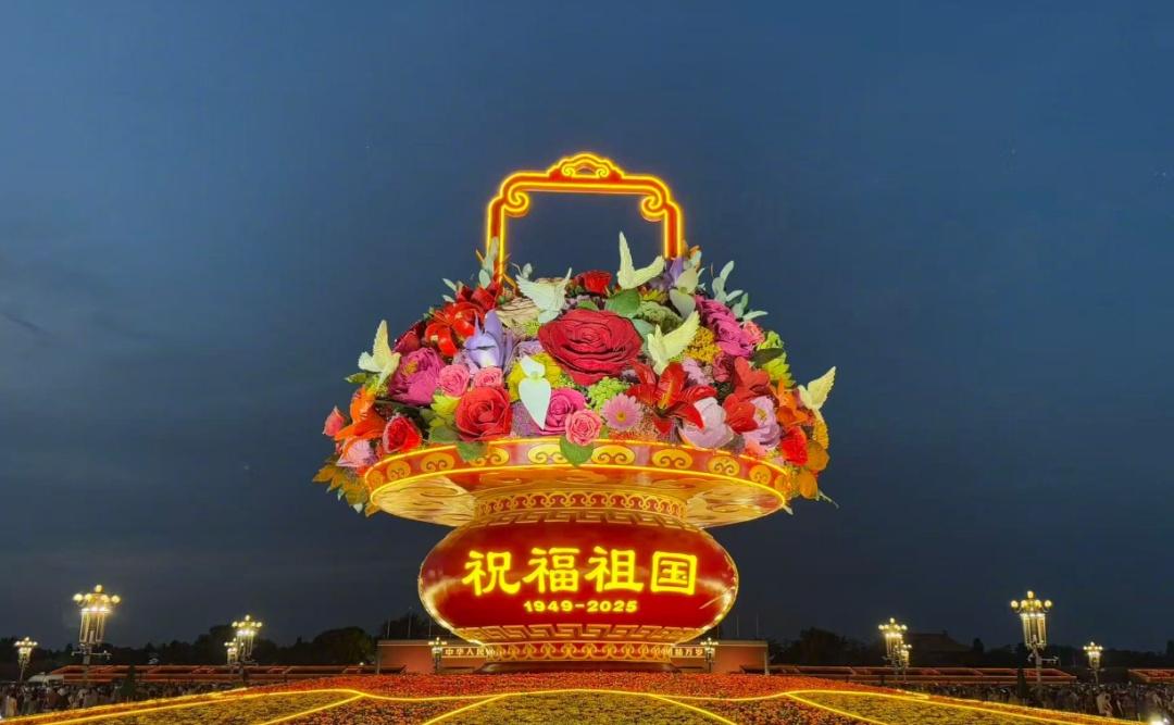 9月25日晚,天安门广场国庆“祝福祖国”大花篮迎来亮灯时刻,现场灯光璀璨,喜庆美好,来往游客如潮,纷纷与“祝福祖国”大花篮留下美好合影。