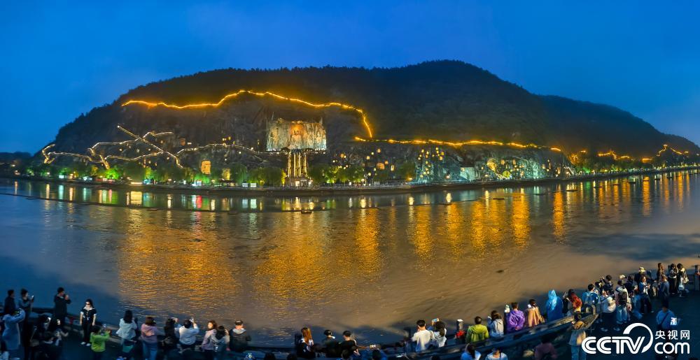 9月27日,河南洛阳龙门石窟景区灯光璀璨,夜景迷人,吸引众多游客感受千年石刻造像艺术的独特魅力。视觉中国