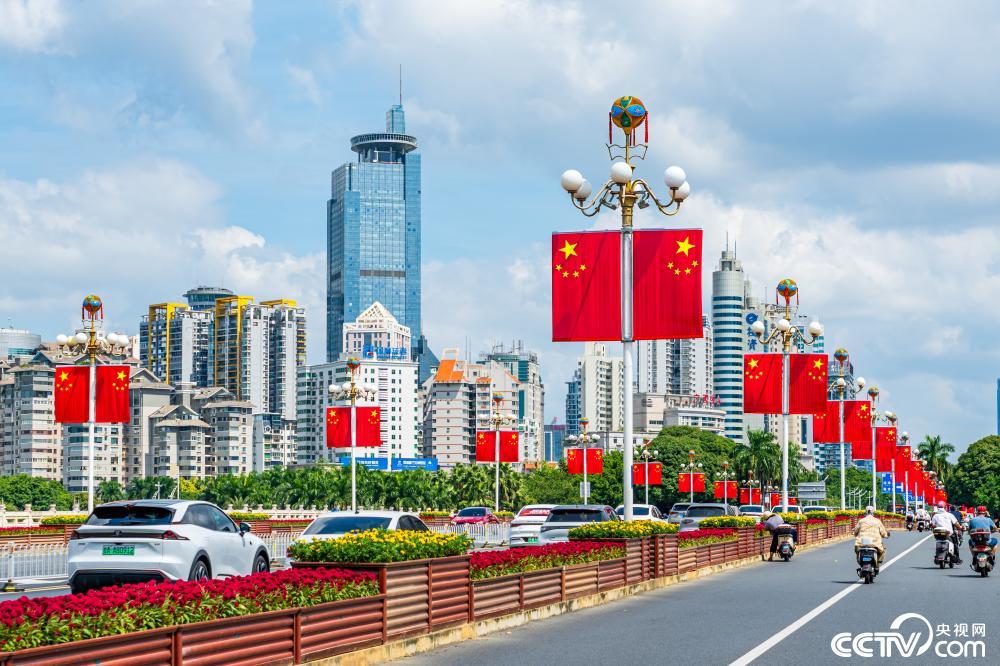 9月27日,广西南宁民族大道的灯杆挂满国旗。