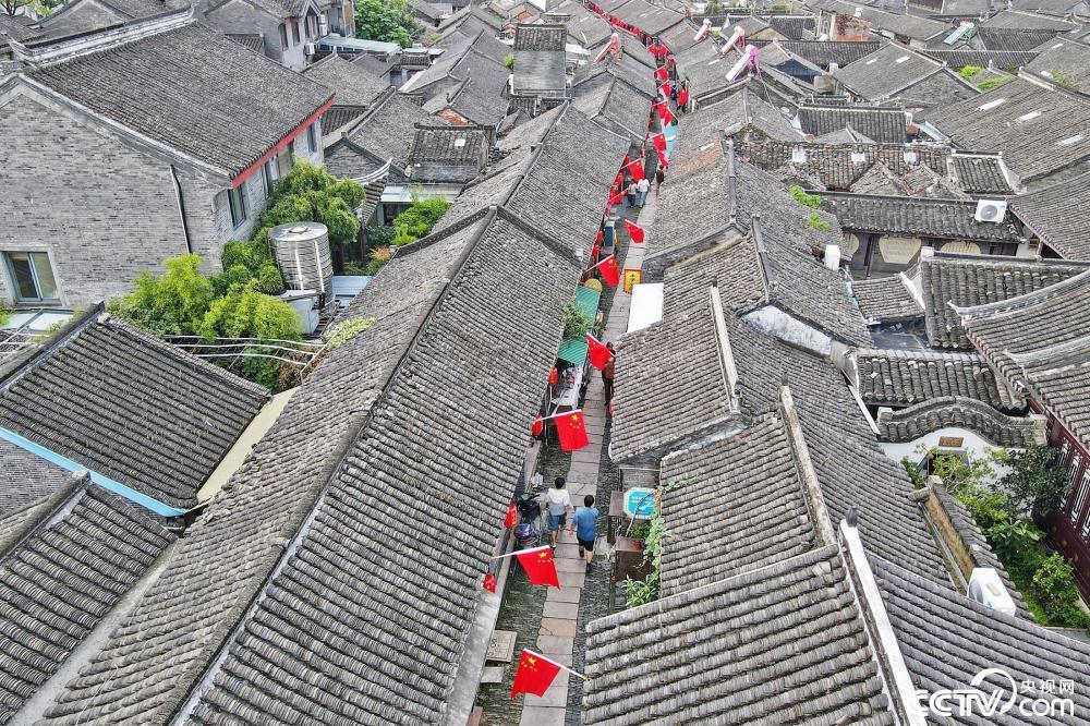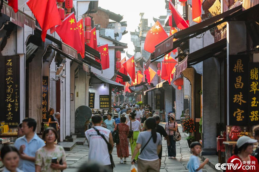 9月28日,安徽黄山屯溪老街悬挂五星红旗,迎接国庆。