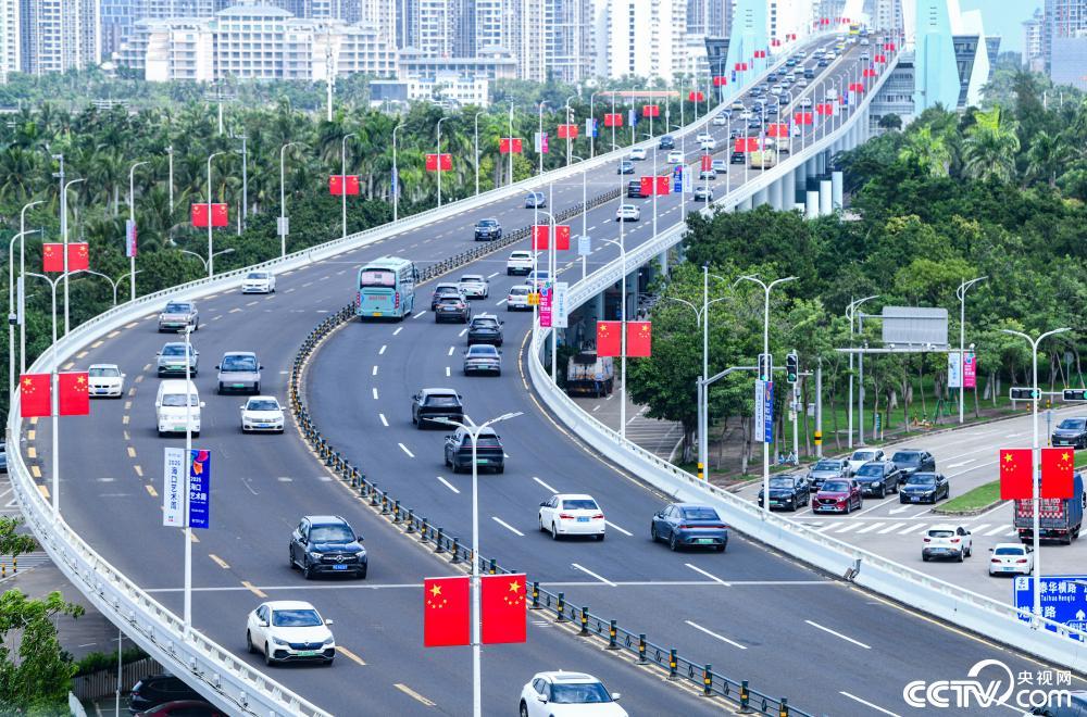 9月27日,海口世纪大桥两侧悬挂五星红旗。