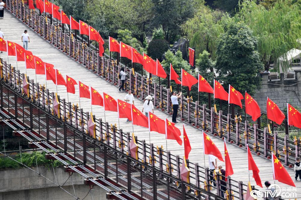 9月27日,贵州仁怀茅台渡口铁索桥上五星红旗迎风飘扬。