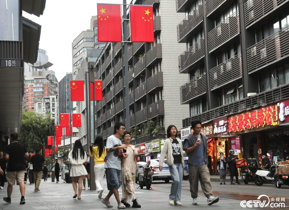 9月28日,四川省成都市街头悬挂五星红旗,节日氛围渐浓。