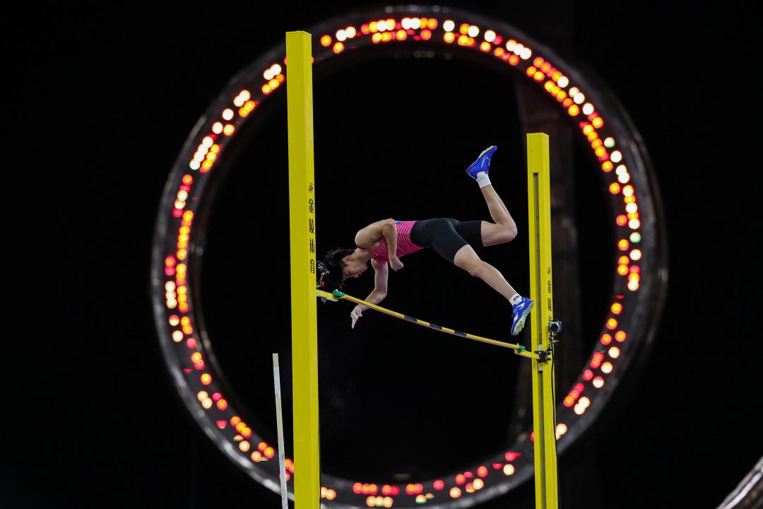 11月19日,十五运会田径男子撑竿跳高决赛,广东选手曾亮越过横杆。