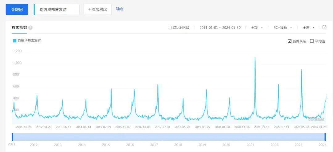 百度指数显示,2011年1月1日至今,关键词“刘德华恭喜发财”的全国搜索指数,每年都会在春节前后达到高位。