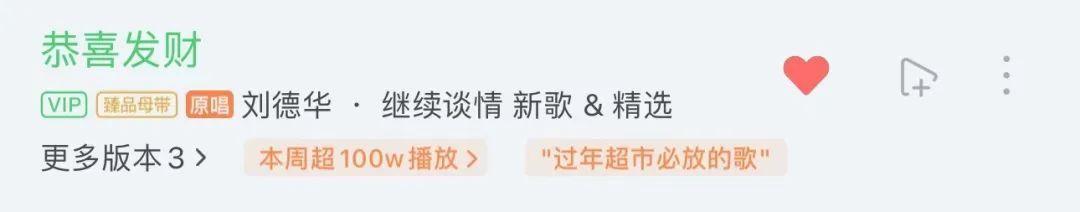 1月31日,记者查询某音乐平台发现,《恭喜发财》在本周的播放量已超100万次,同时带有标签“过年超市必放的歌”。在“春节 | 过年必备热闹欢喜拜年歌”“过年喜庆歌曲大合集”等总播放量较高的“春节歌单”中,《恭喜发财》均排名前列。值得一提的是,在刘德华的所有歌曲中,按照热门排序,《恭喜发财》也排在了首位。