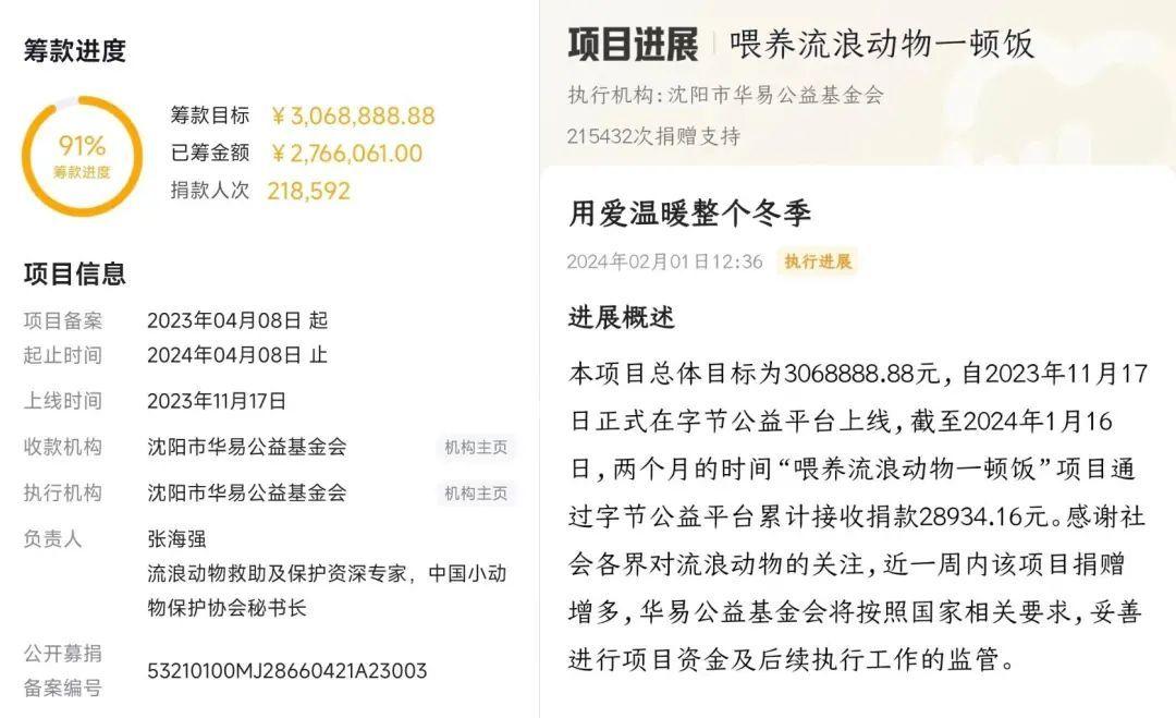 截至2月2日,由中国小动物保护协会秘书长张海强为责任人的“喂养流浪动物一顿饭”项目共吸引20余万人捐款,获得筹款金额276万余元。从1月16日至2月2日,该项目共筹集273万余元。