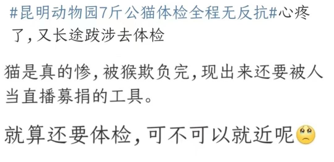 值得注意的是,据南方都市报报道,两只猫在云南时已经接受过云南农业大学动物医院的全面体检。而此次体检行程为房山区到朝阳区,单程路程超过40公里。不少网友质疑此次体检的真实目的及必要性,“真正爱猫的人是不会让猫运来运去的,为啥要从房山运到朝阳再次体检?”“就算还要体检,可不可以就近呢?”“为什么要把猫的行程安排得这么满?”“这个协会是把宠物保护的流量玩明白了。”