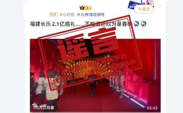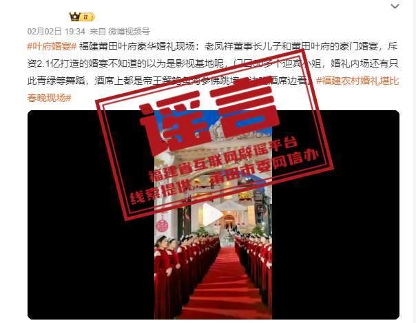 据属地核查,网传“长乐天价婚礼”的新郎本人及其父母均为香港籍,婚礼在自家企业厂房内举办,网上传播情况严重失实;网传“莆田叶府婚宴”中,新郎家里从事黄金珠宝行业,并非老凤祥董事长儿子,相关内容严重不实。而“2.1亿”实为2013年旧闻信息,网上相关账号以“2.1亿”婚礼标签来博眼球、赚流量、蹭炒热点,扰乱网络传播秩序。