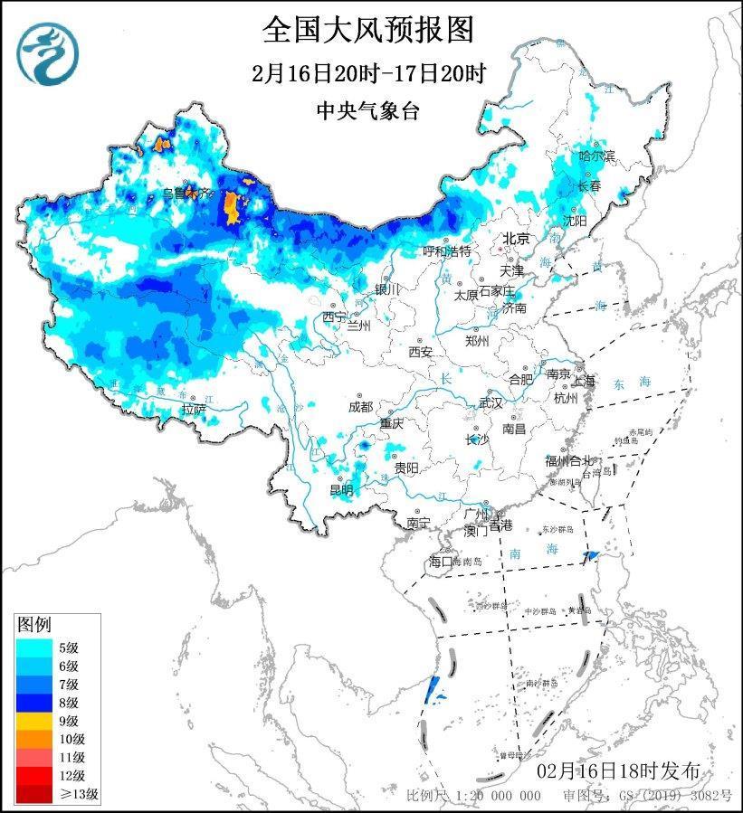 2月17日20时至18日20时,新疆北疆东部和南疆盆地、内蒙古西部、青海西南部、西藏西部、甘肃西部等地将有5~7级、阵风8~9级的大风,新疆山口地区风力可达10级,阵风12~13级;黄海大部海域、东海北部海域将有7级、阵风8~9级的大风。