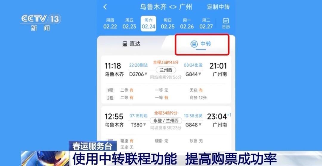 如果通过铁路换乘无法购买到车票,旅客还可以试一试通过分段乘坐民航和铁路的“空铁联运”的方式前往目的地。今年春运,不少火车站推出空铁接驳快线服务。比如,厦门北站启动了“空铁联运”综合服务中心,旅客乘坐高铁到达厦门北站,在车站内就能办理民航值机手续,再通过机场快线、BRT专线快速抵达机场。此外,旅客还可以通过水路与铁路的“铁水联运”以及公路、水路、铁路中转联程换乘的方式前往目的地。(记者 许景云)