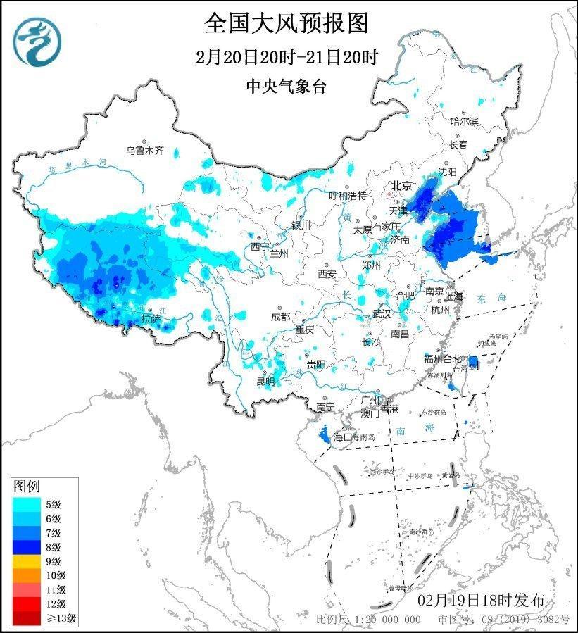 2月20日20时至21日20时,西藏中西部、青海中南部、华北东部、黄淮西部和东部、江淮西部、江汉等地的部分地区有5~6级风,阵风7~8级。渤海、渤海海峡、黄海大部海域将有7~8级,阵风9~10级的大风。