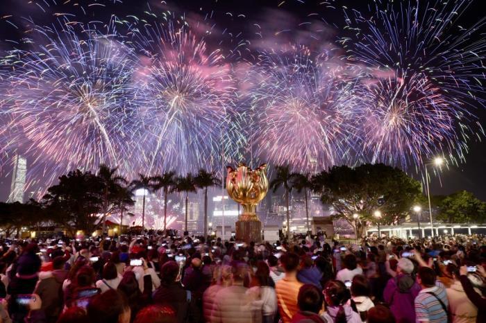 农历新年期间,香港金紫荆广场上演烟花秀。