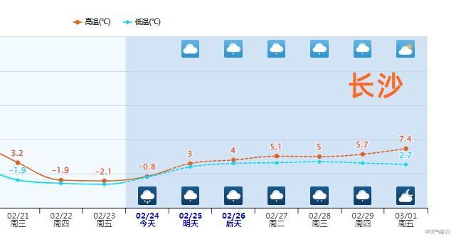 比如长沙,自2月21日14时以后,气温持续在0℃以下运行,已超过70个小时,2月下旬连续如此长的低温,几乎前所未见。2月的最后几天,长沙最高气温将不超过6℃,今天甚至不到0℃,常年同期平均最高气温在10℃以上,比常年冷得多。