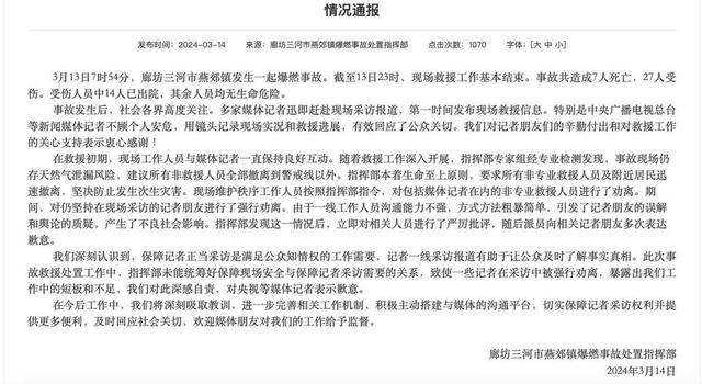 我们深刻认识到,保障记者正当采访是满足公众知情权的工作需要,记者一线采访报道有助于让公众及时了解事实真相。此次事故救援处置工作中,指挥部未能统筹好保障现场安全与保障记者采访需要的关系,致使一些记者在采访中被强行劝离,暴露出我们工作中的短板和不足,我们对此深感自责,对央视等媒体记者表示歉意。