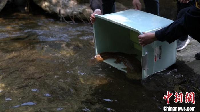 图为江西省庐山市相关部门合力将救助的野生“娃娃鱼”放生大自然。张晓茜 摄