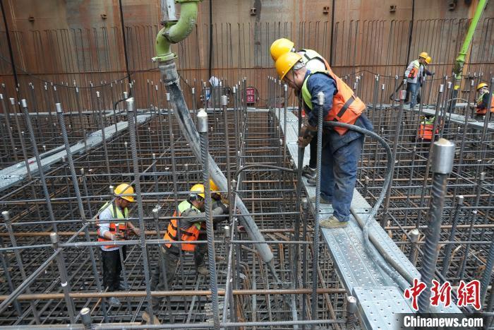 工人正在为池州长江公铁大桥4号墩承台浇筑混凝土。戴志强 摄