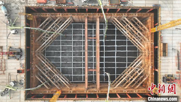 据中铁大桥局池州长江公铁大桥4号墩现场负责人柳振兴介绍,此次浇筑的混凝土体量庞大,浇筑施工过程可能出现混凝土温度急剧升高等技术难题。为此,项目部超前谋划,“多管”齐下。一是措施详细化,在施工前会同武汉理工大学对承台温控施工方案进行研究编制;二是布局提前化,项目部在承台施工过程中预埋冷却水管,待混凝土浇筑后,即可通过水管内循环流动的冷却水对混凝土进行冷却降温;三是过程信息化,在承台预先设置了温控点,安装测温元件,在承台冷却阶段,各温控点将实时监测混凝土温度,并将相关数据反馈至项目部信息化处理中心,项目部可以精准把控承台整体温度情况,随时调整冷却水管中水流速度,避免出现大体积混凝土因散热不均产生质量问题。
