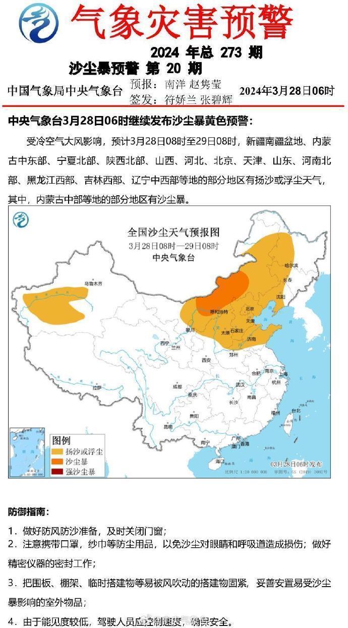 中央气象台3月28日06时继续发布沙尘暴黄色预警。