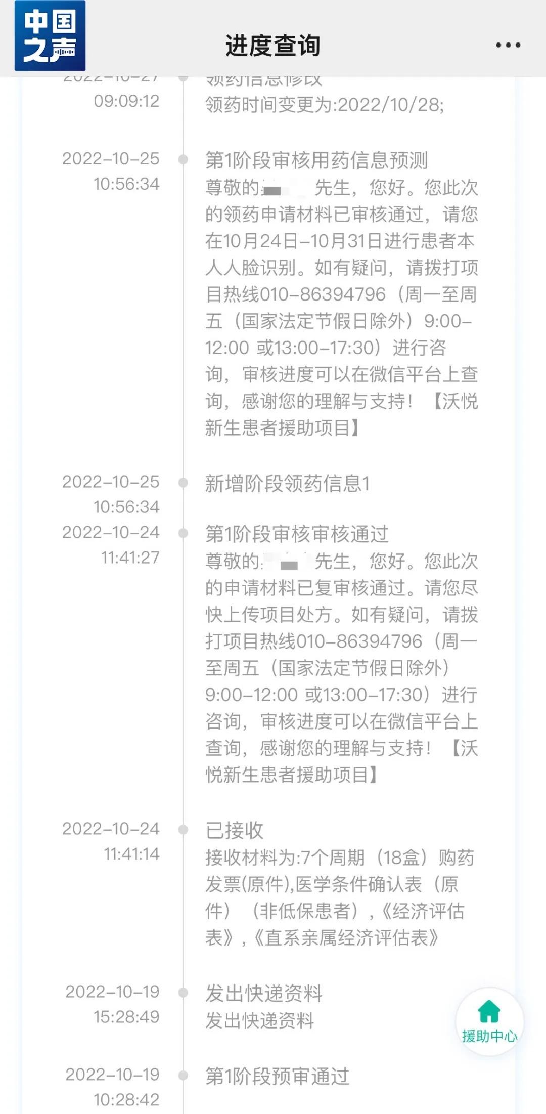 随后,经医药代表提供申请资料,小张提交给“沃悦新生”并且审核通过开始领药,在2022年10月28日领到了第一阶段的4盒药。之后,领药过程都比较顺利。
