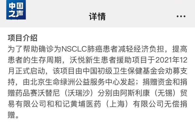 在患者们一筹莫展之际,3月27日,“沃悦新生”公众号又发布了一则公告。公告声明,经向多方积极筹募,阿斯利康(无锡)贸易有限公司愿意捐赠项目后续所需的药品赛沃替尼和项目运行所需的捐赠资金。