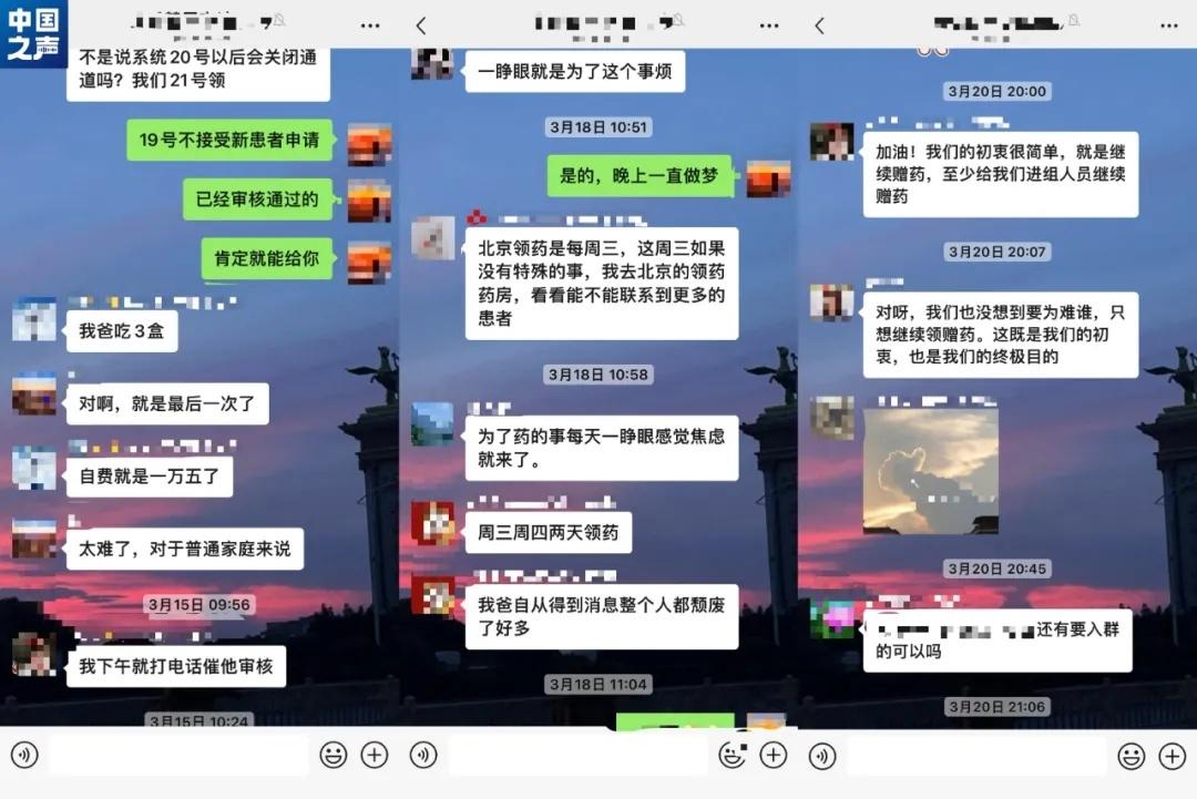 △患者在维权群内探讨援助药品停发(受访者供图)