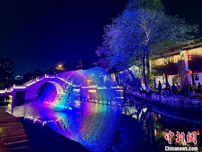 在灯光照耀下,人、水、桥、老房子构成独特风景。项菁 摄