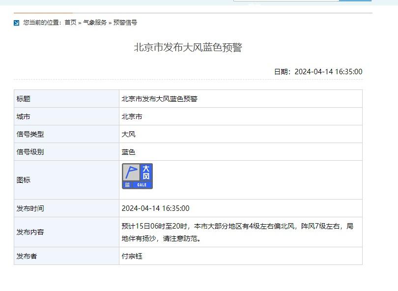 北京市气象台2024年4月14日16时35分发布大风蓝色预警信号:预计15日06时至20时,北京市大部分地区有4级左右偏北风,阵风7级左右,局地伴有扬沙,请注意防范。