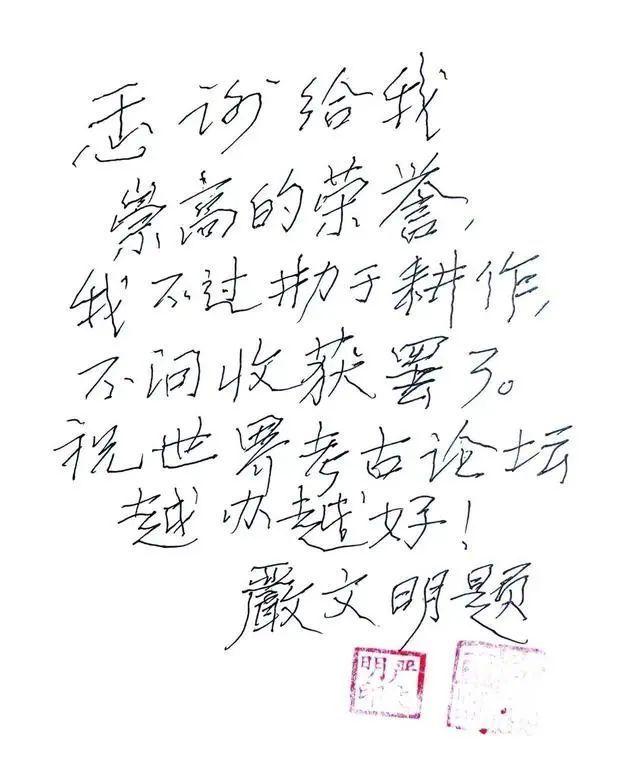 严文明手写的获奖感言:“感谢给我崇高的荣誉,我不过勤于耕作,不问收获罢了。”