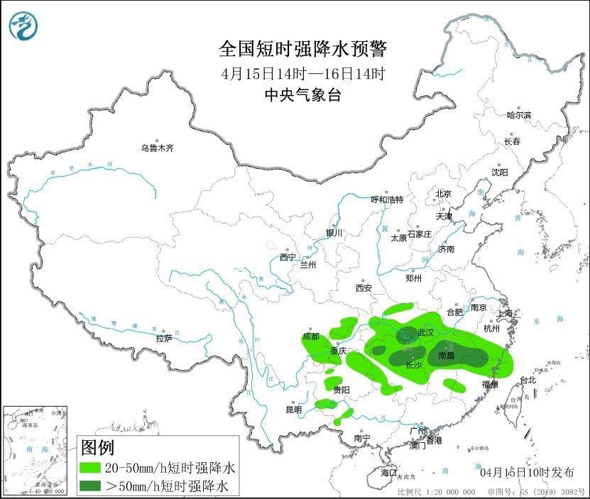 预计4月15日14时至16日14时,湖北东部和南部、湖南中北部和西南部、江西中北部、浙江中南部、福建北部、四川盆地中东部、重庆西部、贵州中西部等地的部分地区将有8-10级雷暴大风或冰雹天气,局地风力可达11级以上;湖北南部、湖南、江西、浙江中南部、福建北部、四川盆地中东部、重庆、贵州中西部和东北部、广西西部和东北部等地的部分地区将有短时强降水天气,最大小时雨量30-60毫米,局地可达70毫米以上。