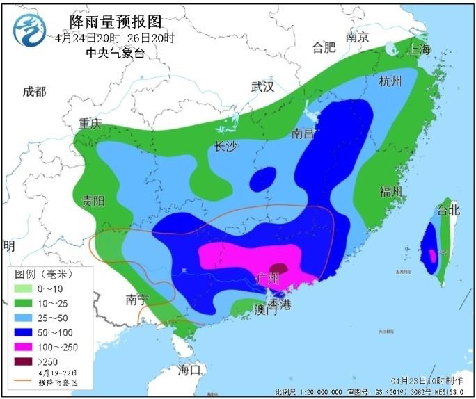 中央气象台预计,24日夜间至26日白天,江南中南部和东部、华南北部和中东部及贵州东部等地有大雨或暴雨,广东中部和西北部、广西东北部等地有大暴雨,局地伴有雷暴大风等强对流天气。上述地区累计雨量有30~80毫米,广东中部、广西东北部等地部分地区100~240毫米,局地可达250~300毫米。