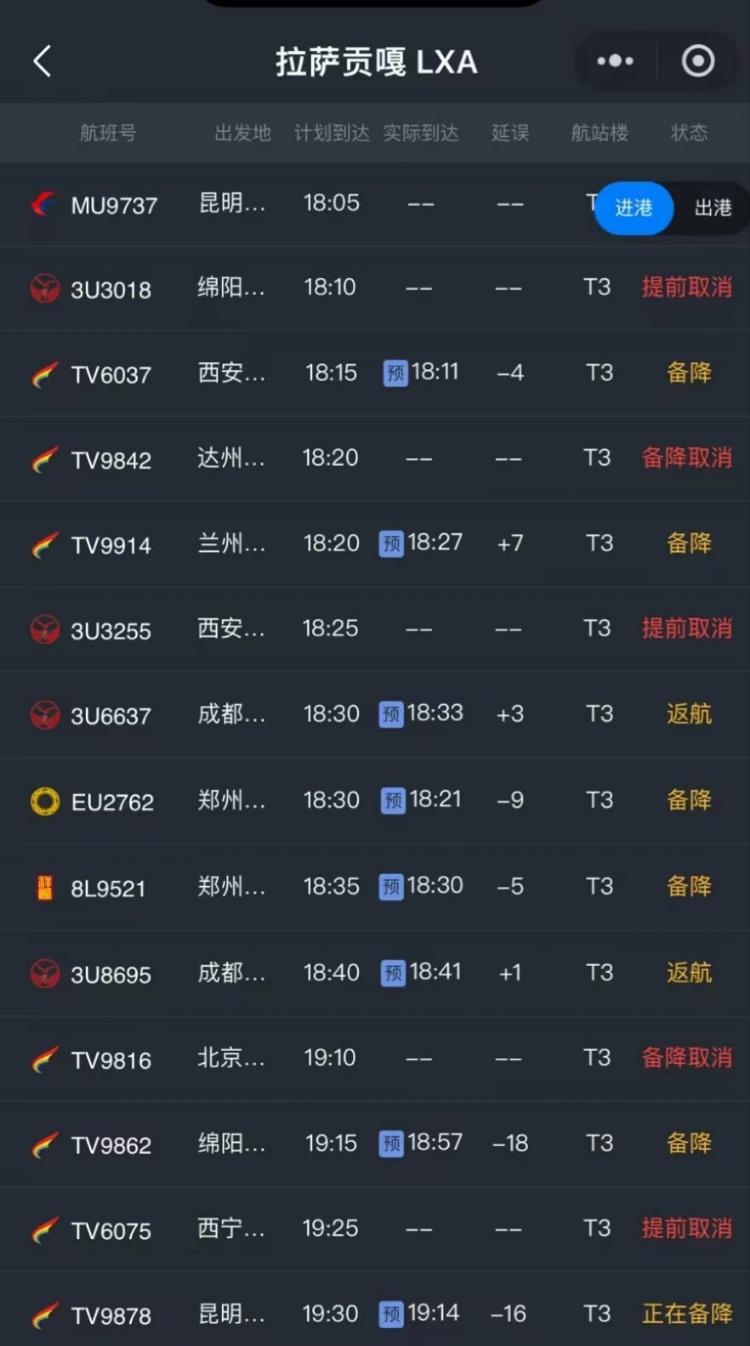 航班动态显示,1日下午四点半后前往拉萨的航班全部未能到达。 网络截图