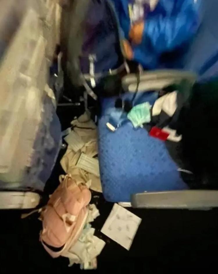 从上海飞往香港的国泰航空CX341次航班,4月30日当天遭遇恶劣天气,机舱内散落了不少乘客的行李。 网络图