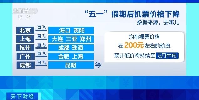 旅游平台数据显示,5月6日至5月8日,机票平均支付价格环比一周前(5月1日—5月3日)下降14%。目前,从北京直飞海口、贵阳,上海直飞大连、三亚、郑州,杭州直飞成都、珠海,广州直飞合肥、上海,成都直飞昆明等航线,均有裸票价格在200元左右的航班。预计机票低价将持续至5月中旬。