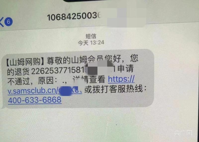 山姆会员商店发送给消费者的短信显示:“您的退货(订单编号)申请不通过,原因:。,。”(受访者供图 央广网发)
