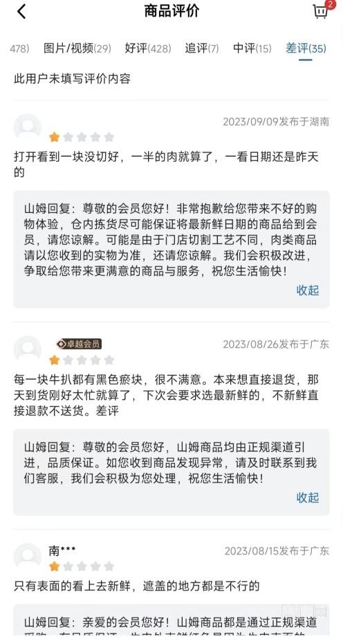 5月8日,记者登录山姆会员商店官方App,在肉类项里查看一款销量最高的、价值114元的美国谷饲上脑薄切0.9kg,该商品有4万多条评价,其中差评1000多条。