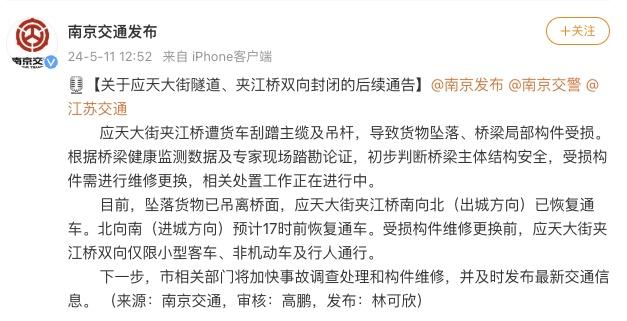 央视网消息:据@南京交通发布 微博最新通报,应天大街夹江桥遭货车刮蹭主缆及吊杆,导致货物坠落、桥梁局部构件受损。根据桥梁健康监测数据及专家现场踏勘论证,初步判断桥梁主体结构安全,受损构件需进行维修更换,相关处置工作正在进行中。目前,坠落货物已吊离桥面,应天大街夹江桥南向北(出城方向)已恢复通车。北向南(进城方向)预计17时前恢复通车。受损构件维修更换前,应天大街夹江桥双向仅限小型客车、非机动车及行人通行。下一步,市相关部门将加快事故调查处理和构件维修,并及时发布最新交通信息。