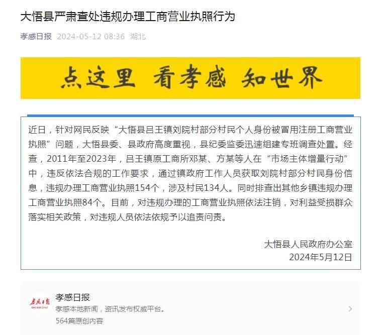近日,针对网民反映“大悟县吕王镇刘院村部分村民个人身份被冒用注册工商营业执照”问题,大悟县纪委监委组建专班调查处置。经查,2011年至2023年,吕王镇原工商所邓某、方某等人在“市场主体增量行动”中,违反依法合规的工作要求,通过镇政府工作人员获取刘院村部分村民身份信息,违规办理工商营业执照154个,涉及村民134人。同时排查出其他乡镇违规办理工商营业执照84个。目前,对违规办理的工商营业执照依法注销,对利益受损群众落实相关政策,对违规人员依法依规予以追责问责。