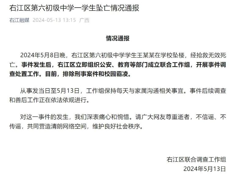 2024年5月8日晚,右江区第六初级中学学生王某某在学校坠楼,经抢救无效死亡。事件发生后,右江区立即组织公安、教育等部门成立联合工作组,开展事件调查处置工作。目前,排除刑事案件和校园霸凌。