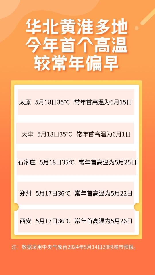 预计后天开始,北方大部将有晴热天气,而且暖热继续升级!尤其是华北、黄淮以及陕西关中等多地将出现今年的首个高温,相比常年偏早。大城市中,太原、天津、石家庄、郑州、西安都有可能挑战今年首个高温。北京14日最高气温也将达到34℃,刷新今年来新高。