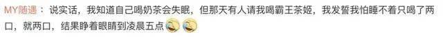 对此,网友表示自己也有同样的经历。有网友称,自己喝了30年绿茶,以为喝奶茶不会失眠,没想到早上一杯,凌晨2点还睡不着。很多网友表示,不只是霸王茶姬,很多茶饮咖啡品牌都堪称“失眠神器”。