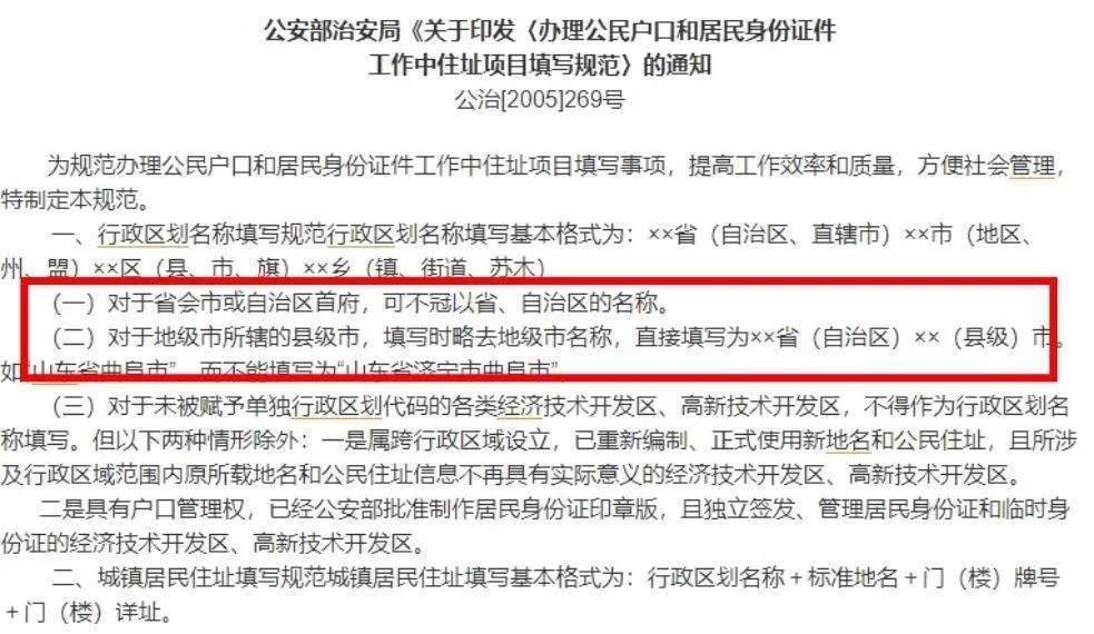 这个问题,答案也是明确的。根据公安部《办理公民户口和居民身份证件工作中住址项目填写规范》规定,对于地级市所辖的县级市,填写时略去地级市名称,直接填写为××省(自治区)××(县级)市。如“山东省曲阜市”,而不能填写为“山东省济宁市曲阜市”。
