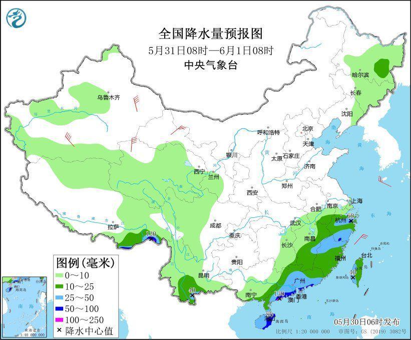 5月31日8时至6月1日8时,黑龙江东南部、西藏东南部、江南中东部和南部、云南西南部、华南中北部和南部、台湾岛等地部分地区有中到大雨,其中,西藏东南部、浙江北部、广东西南部和东南部沿海、海南岛东部等地部分地区有暴雨或大暴雨(100~130毫米)。甘肃河西部分地区有4~6级风,,新疆南疆盆地和东部、青海西部等地部分地区有6~7级风。