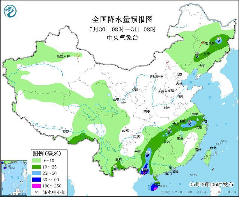 5月30日8时至31日8时,内蒙古东南部、黑龙江东南部、吉林中部、辽宁北部、西藏东南部、江淮东部和西部、江汉东部、江南北部、西南地区东南部、云南东南部、广西东北部、华南南部和海南岛等地部分地区有中到大雨,其中,广西南部和北部、海南岛南部等地部分地区有暴雨或大暴雨(100~160毫米)。内蒙古中部、吉林西部、新疆东部等地部分地区有4~6级风,南海大部海域将有7级、阵风8级的大风,其中,广东沿岸海域风力可达8级,阵风9级。