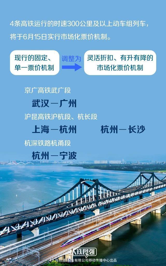 记者从中国铁路客户服务中心获悉,京广高铁武广段,沪昆高铁沪杭段、杭长段,杭深铁路杭甬段等4条高铁运行的时速300公里及以上动车组列车将于6月15日实行灵活折扣、有升有降的市场化票价机制,相关列车车票将于6月1日开始发售。