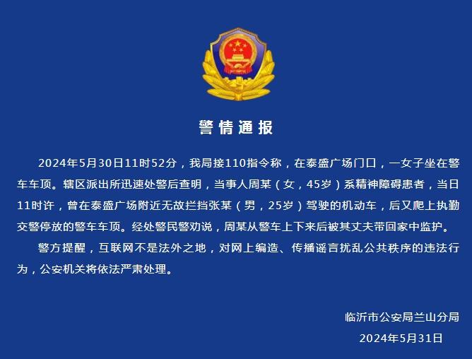 兰山公安微信公号消息,2024年5月30日11时52分,我局接110指令称,在泰盛广场门口,一女子坐在警车车顶。辖区派出所迅速处警后查明,当事人周某(女,45岁)系精神障碍患者,当日11时许,曾在泰盛广场附近无故拦挡张某(男,25岁)驾驶的机动车,后又爬上执勤交警停放的警车车顶。经处警民警劝说,周某从警车上下来后被其丈夫带回家中监护。