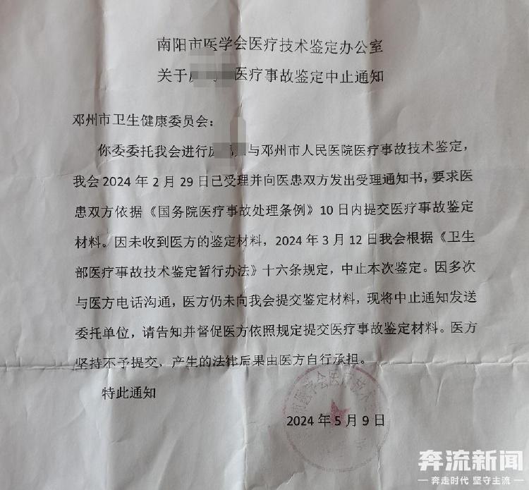 庞先生了解到,邓州市人民医院至今未提交相关鉴定材料,导致医疗事故鉴定无法进行。