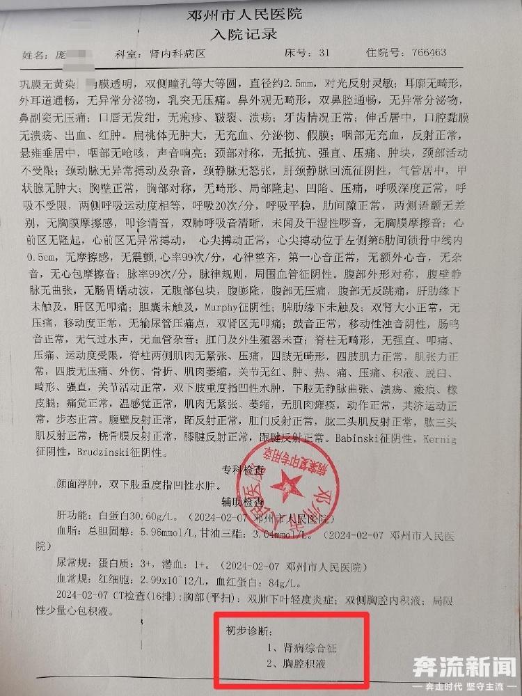 在进行一系列检查后,丽丽被诊断为肾病综合征,入住医院肾内科治疗。邓州市人民医院出具的病历资料显示:入院诊断为肾病综合征、胸腔积液、心包积液、肺炎、贫血。“患者入院后完善相关检查,给予肾脏穿刺活检,应用激素、抗凝、保护肾功能、减少尿蛋白、抗感染及对症治疗”。多日的查房记录上,也注明“肾病综合征较重”“肾病面容”。