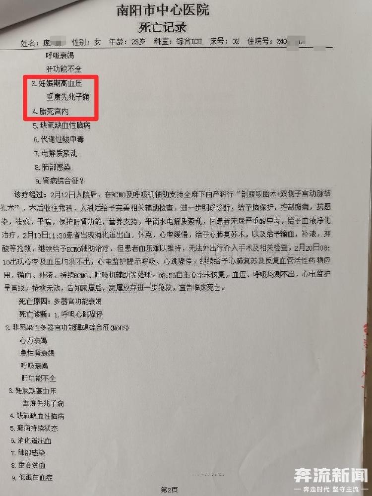 2月12日上午,丽丽被转运到南阳市中心医院急危重症孕产妇救治中心,诊断结果和南阳市第一人民医院一致,立即安排进行剖宫取胎手术。手术后,丽丽一直在昏迷状态,持续到2月20日死亡。