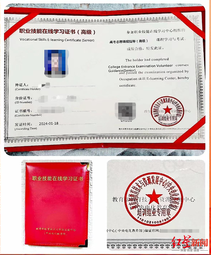 一家培训机构告诉记者,“0基础、0门槛,从0起步学习掌握高考报考”,只需要21课时,每课1.5小时,“21天成为高考规划师”,获得教育部官方颁发的证书,其提供证书盖章为教育部教育技术与资源发展中心培训结业专用章。其培训费用原价3680元,限时优惠价格只要1680元。“培训后可以入驻平台,免费使用高考报考大数据,平台推荐客户。”